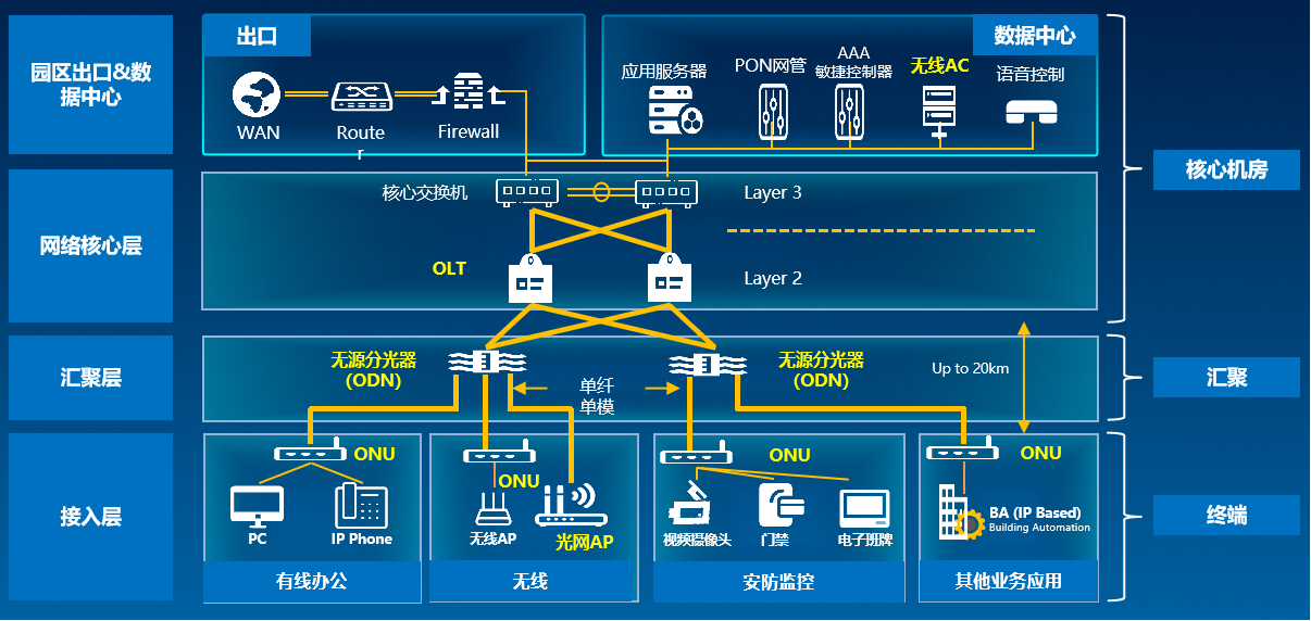 金数据全光网顺利获得各种形态的ONU设备给予有线网络接入,顺利获得室内、高密、室外、面板等各种型号AP和光AP为楼内用户给予无线网络接入